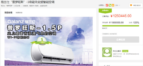 据了解,6月11日格兰仕携手苏宁易购开创空调新玩法,网友只需要支持1元钱,就能将1.5P的全新普罗旺斯空调搬回家。活动开筹5秒内999元抢购支持档秒空,20分钟内2399档支持档也一抢而空。截止6月23日已经筹集到资100万元,共获得2000人的支持。最终,此次项目筹集资金突破125万,达成率高达125%。格兰仕“普罗旺斯”空调及众筹平台的超高人气由此可见一斑。